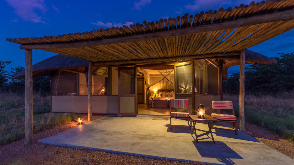 Fly from Victoria Falls into Hwange National Park, Zimbabwe's largest wildlife reserve, and settle into the rustic elegance of Camp Hwange. This classic safari camp serves as your base for exploring the park's diverse landscapes and abundant wildlife. Camp Hwange offers comfortable and spacious en-suite tents nestled amidst the wilderness. Unwind on the veranda overlooking a watering hole, gather around the crackling campfire at night, and savor delectable meals prepared with fresh, local ingredients.